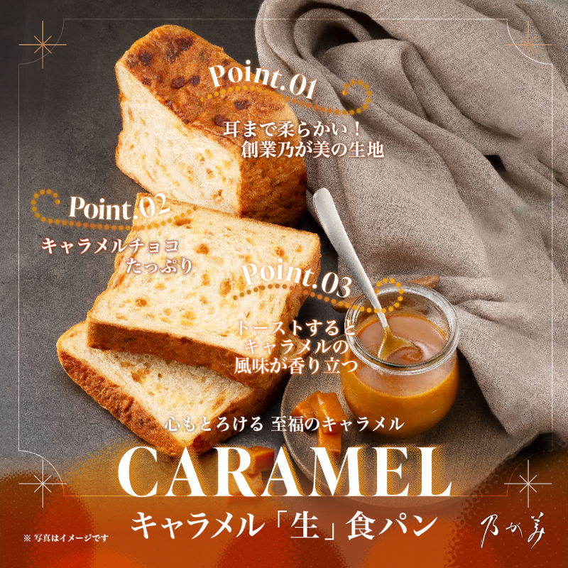 本商品は珈琲や紅茶のお供として楽しんでいただくために、耳までやわらかく、しっとりとした口どけが特徴の「創業乃が美」に、キャラメルの甘く香ばしい風味をまとわせました。生地に練り込まれたキャラメルチョコが、口の中に溶け出してくるようで、パン生地のミルク感と相まって、絶妙なコンビネーションを醸し出してくれます。